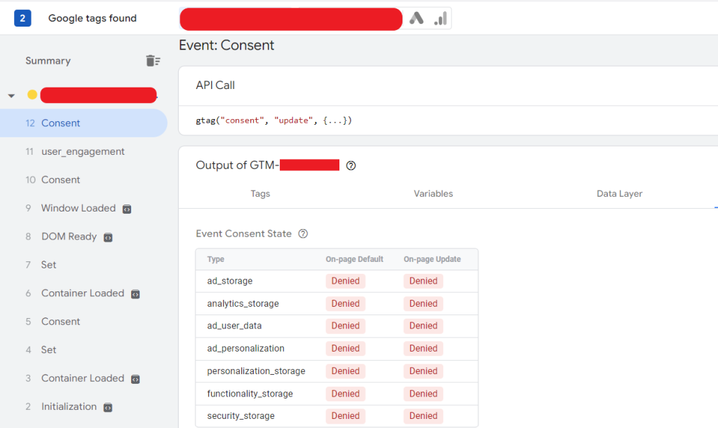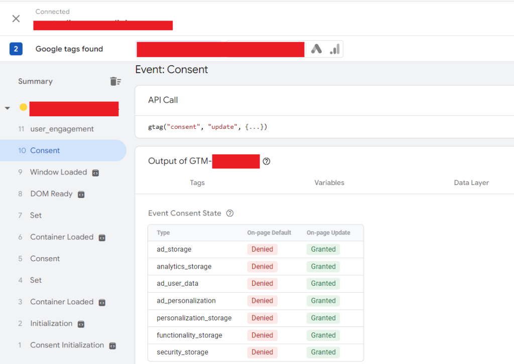 Per capire se la tua Consent Mode funziona correttamente, puoi utilizzare la funzione di anteprima e debug di Google Tag Manager. Se l'installazione è corretta, vedrai lo stato dei tag cambiare in base alle scelte fatte sul banner:
