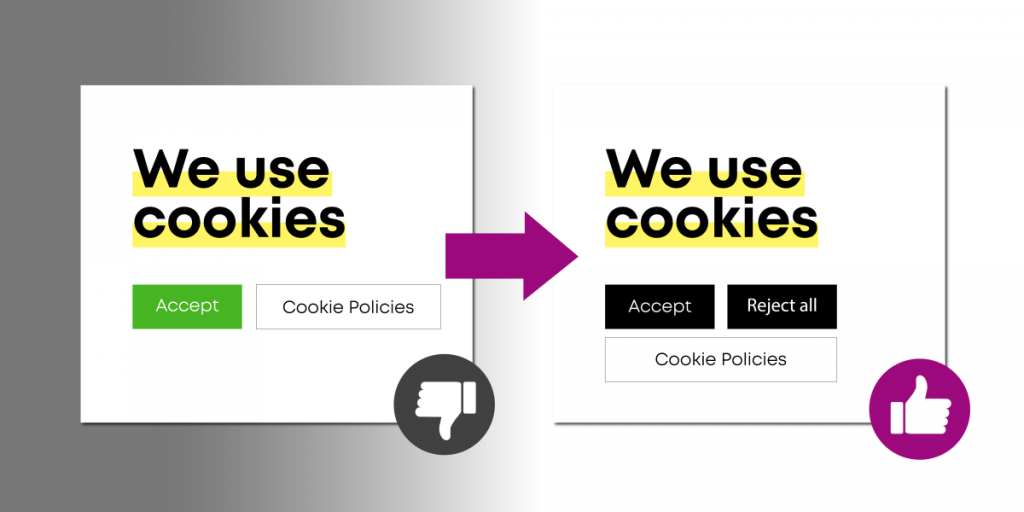 Per anni, i siti web hanno usato banner cookie rudimentali, spesso con la sola funzione di un "disclaimer" o un semplice pulsante "OK". Questi banner, però, non garantivano una vera accettazione o rifiuto da parte dell'utente. Cliccare su "OK" o sulla "X" significava solo chiudere la finestra, mentre i cookie venivano comunque salvati e processati.