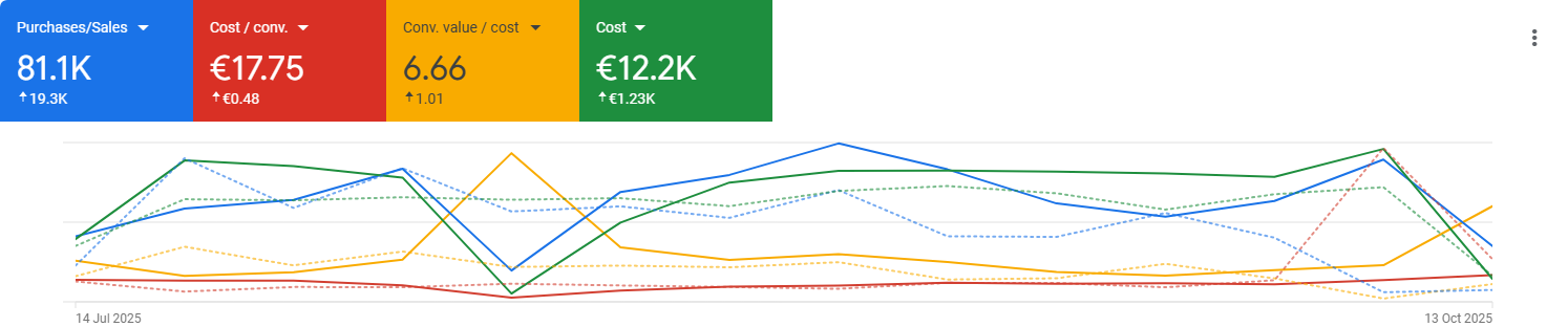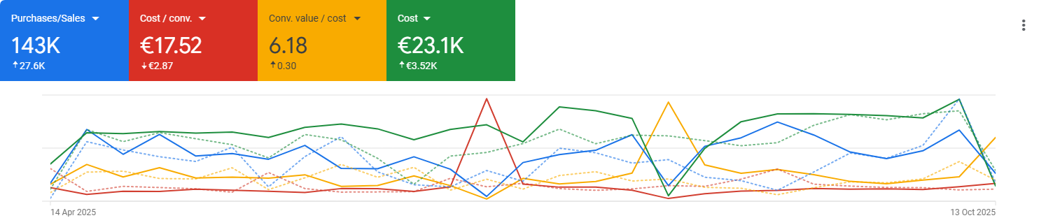 Il caso studio che presentiamo, basato sui dati visivi allegati, mostra come una ristrutturazione strategica completa abbia portato a risultati eccezionali, superando gli 81.1K di acquisti/vendite nel periodo recente (16 Luglio – 13 Ottobre 2025) e, su un orizzonte temporale più ampio (17 Aprile – 13 Ottobre 2025), a ben 143K € totali, con un ROAS (Conv. Value / Cost) consolidato a 6.18 (+0.30) e un Costo per Conversione (CPA) stabile a €17.52.