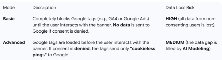 The Advanced Mode is strongly recommended by Google to maximize data collection in a compliant manner, as it enables Conversion Modeling.
