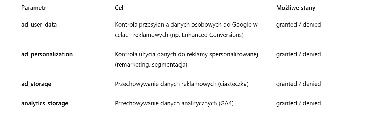 Te dwa parametry są kluczowe do wysyłania sygnałów zgody dotyczących danych osobowych na potrzeby reklamowe: